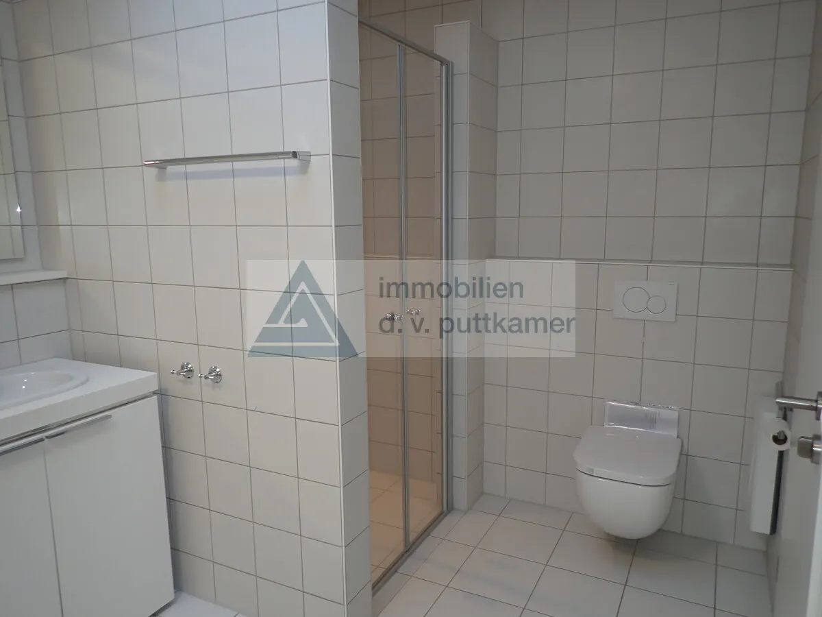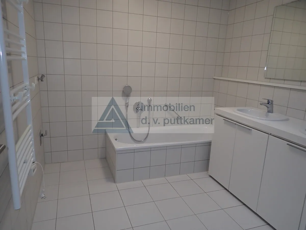 Das Badezimmer ist ein wahres Highlight dieser Wohnung: Es bietet eine barrierefreie Dusche, eine separate Badewanne, einen Doppelwaschtisch und ein WC. Hier können Sie entspannte Stunden genießen. Ein zusätzliches Gäste-WC rundet das Angebot ab.